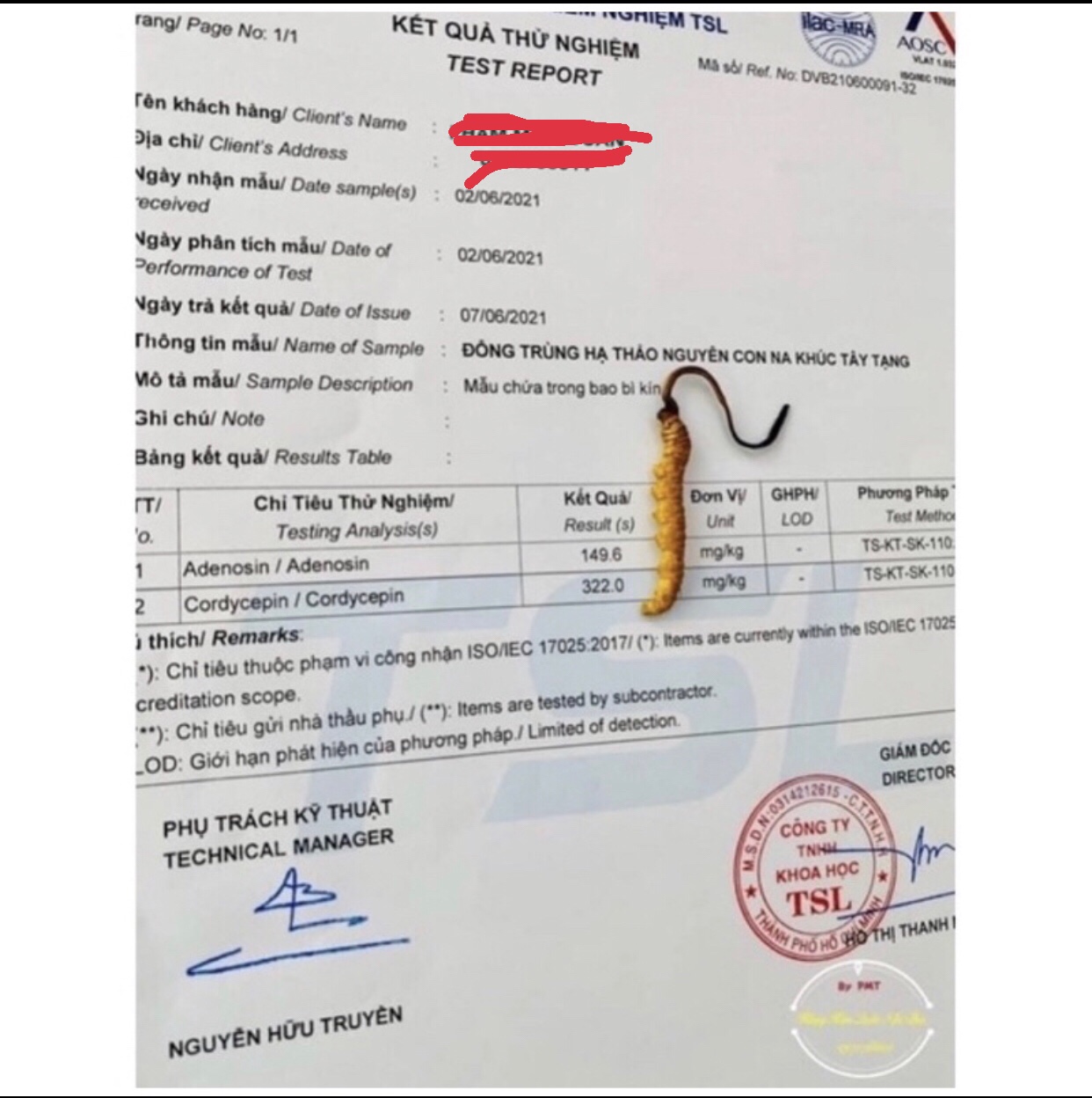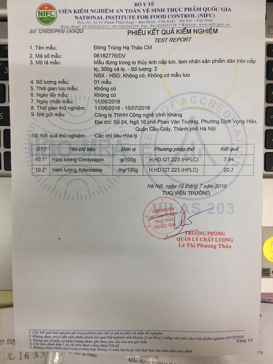 Với hàm lượng dược tính Cordycepin và Adenosine như phiếu kiểm định ở trên chúng tôi khẳng định Đông trùng Hạ thảo Vĩnh Khang có dược tính HÀNG ĐẦU tại Việt Nam. Vĩnh Khang là đơn vị đầu tiên và duy nhất tại Việt Nam cam kết hàm lượng dược chất với đối tác trong và ngoài nước.
