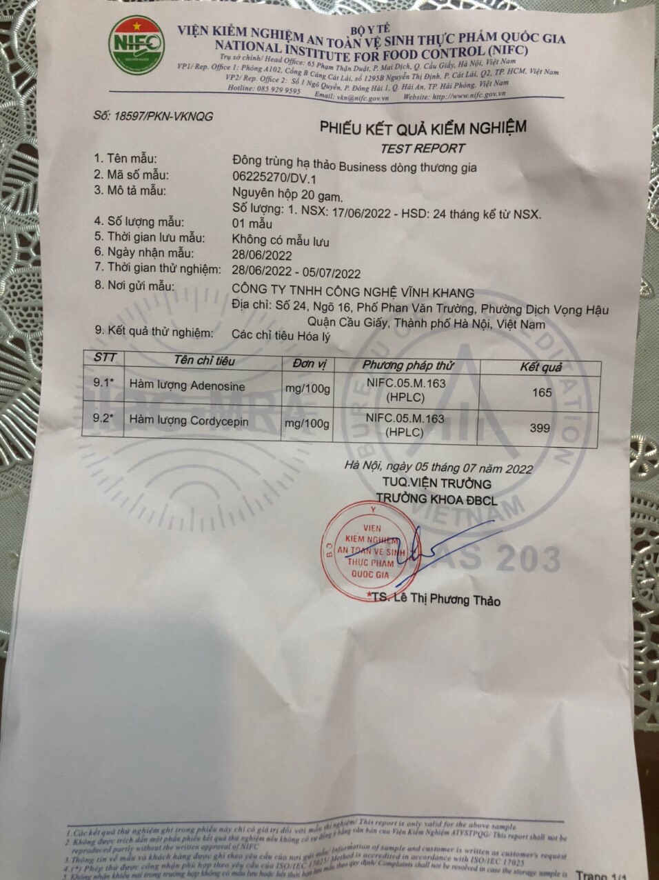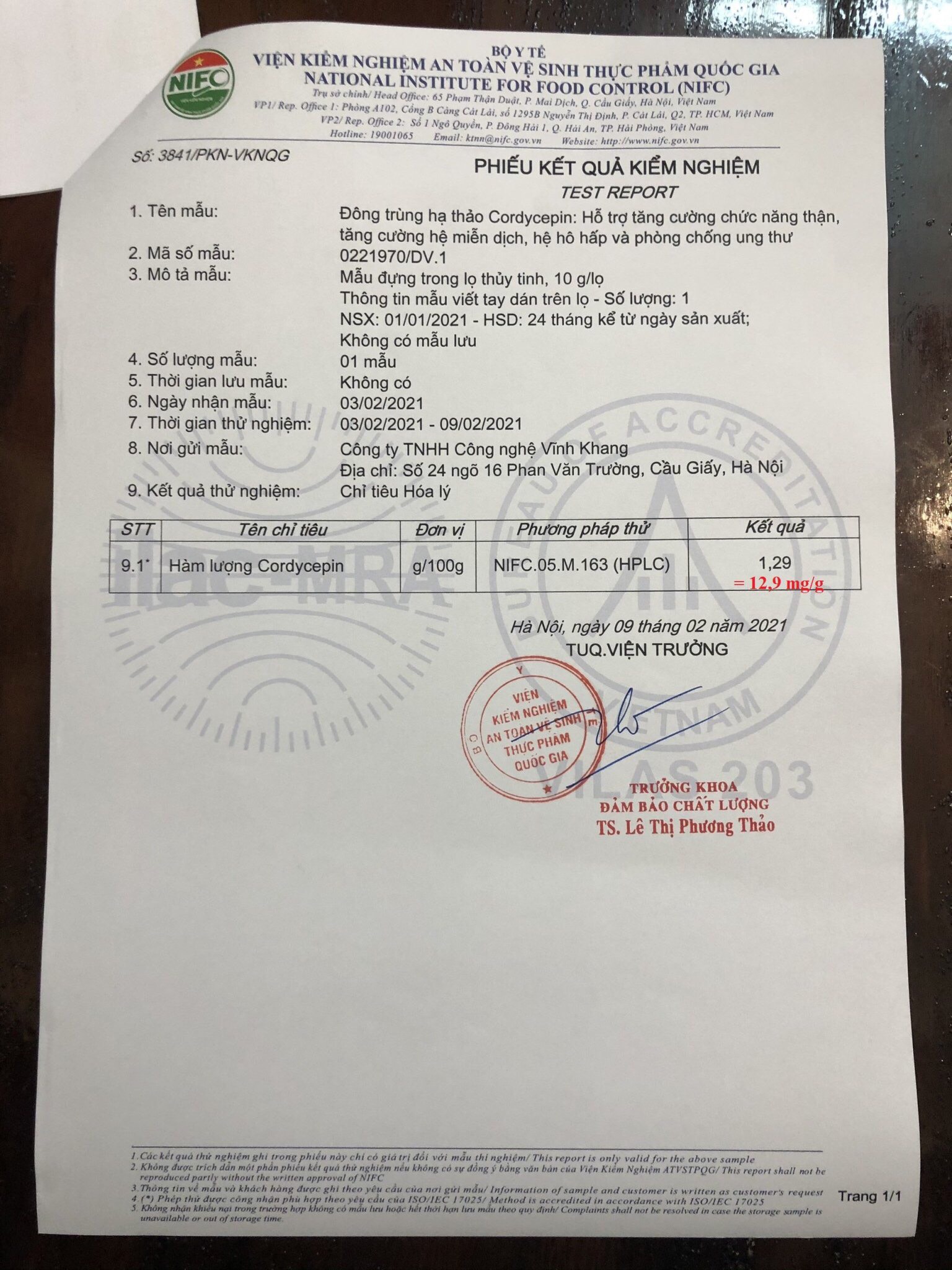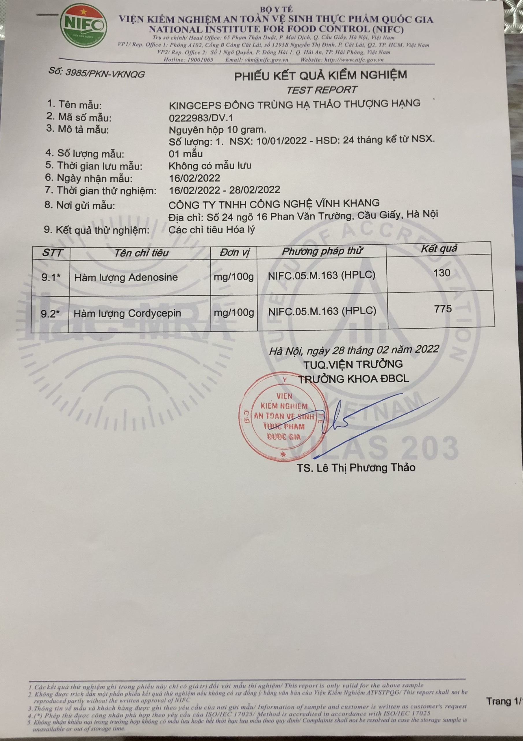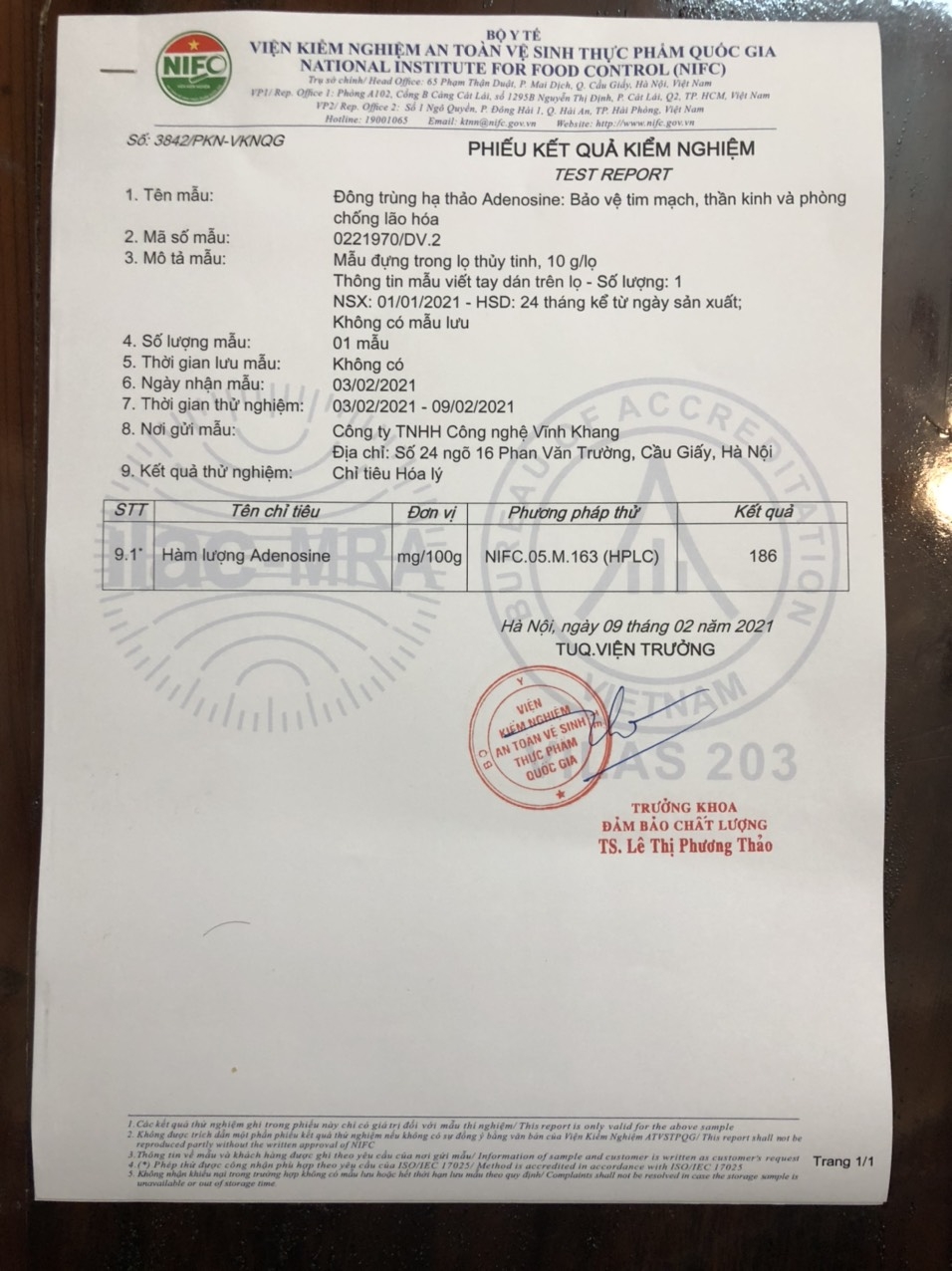 Phiếu phân tích hàm lượng Corydcepin và Adenosine năm 2022 của Vĩnh Khang: