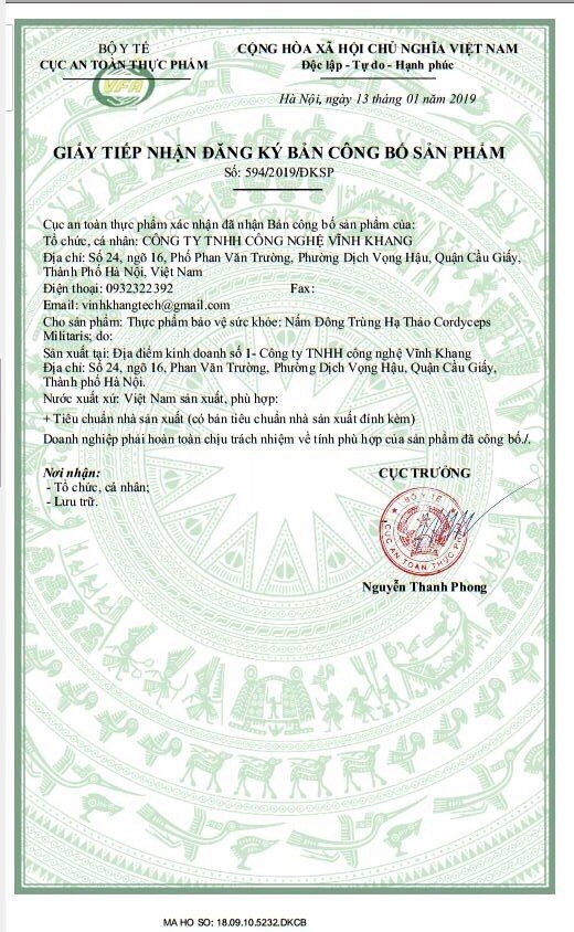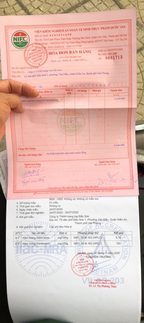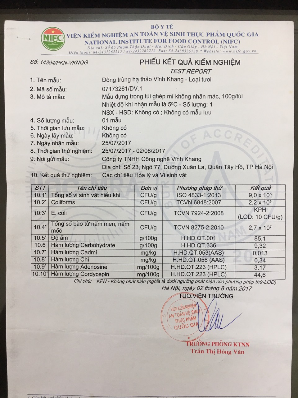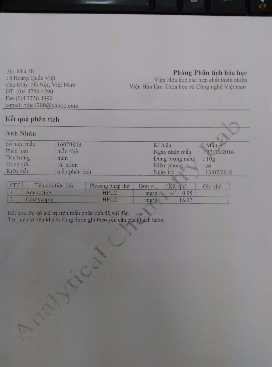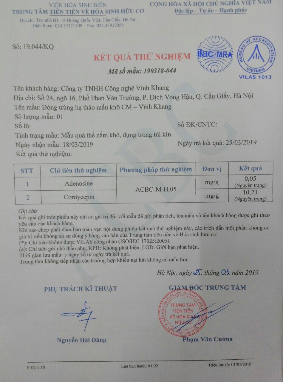 - 2017: Vĩnh Khang phân tích loại tươi. Quý khách nhân chỉ số Adenosine, Cordycepin với 10 sẽ ra chỉ số đối với hàm lượng khô.