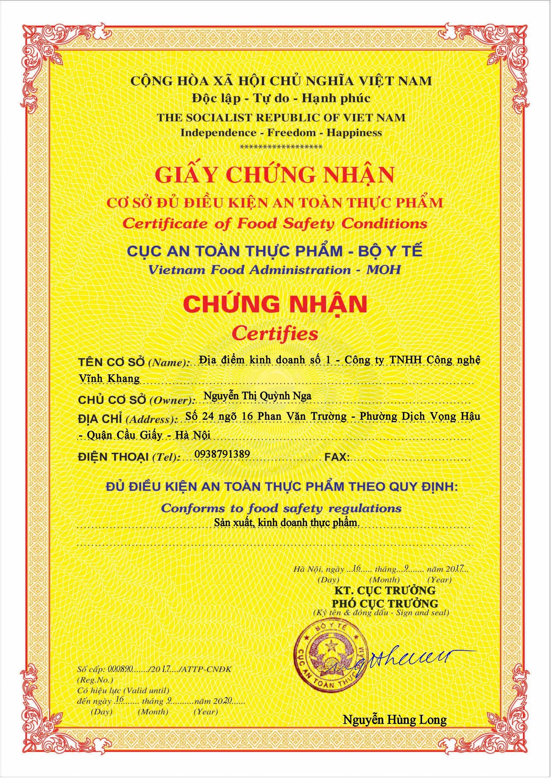 Giấy chứng nhận nguồn gốc xuất xứ của sản phẩm (Giấy chứng nhận cơ sở ATTP và Công bố chất lượng sản phẩm)